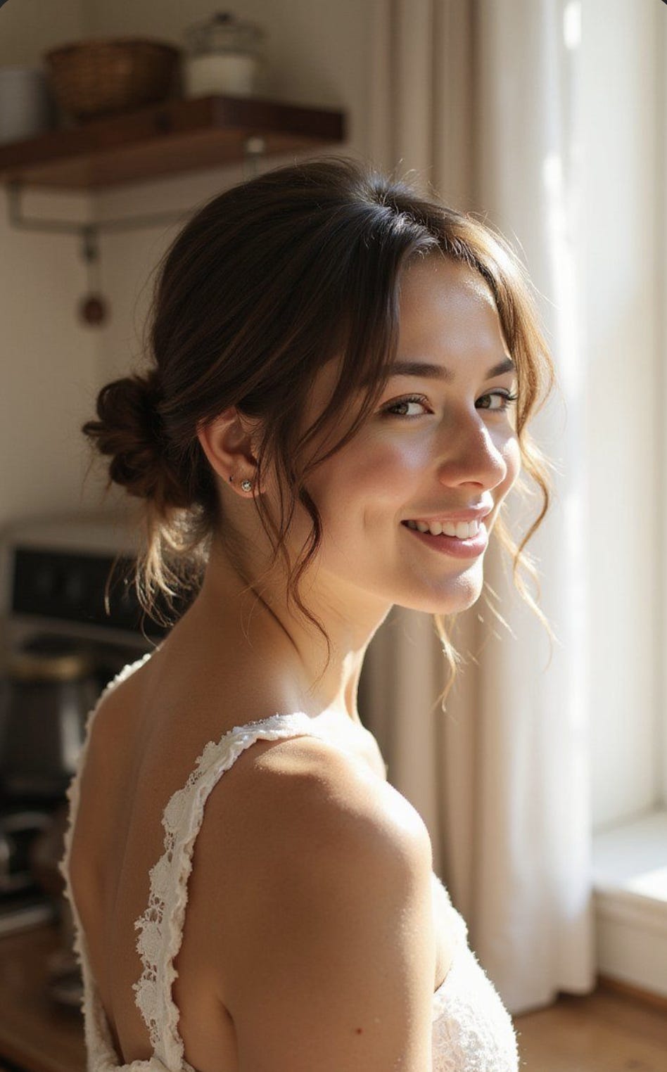 When you wear your hair up, make sure you pull some out to frame your face. You want to pull out more than you think and don’t just take it from the top by your forehead, also pull some from near your ears. This AI girl is a good example. (She also has good makeup)